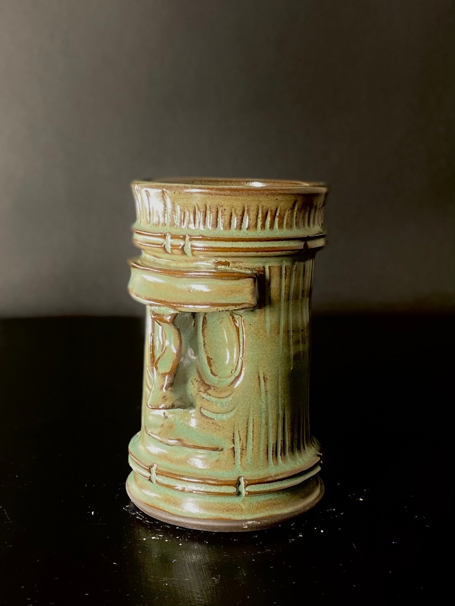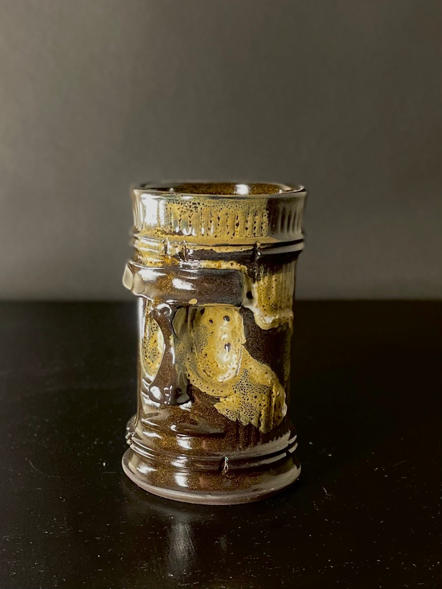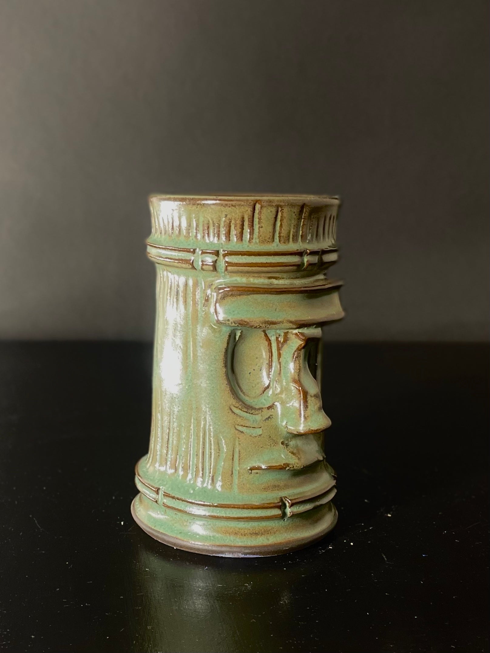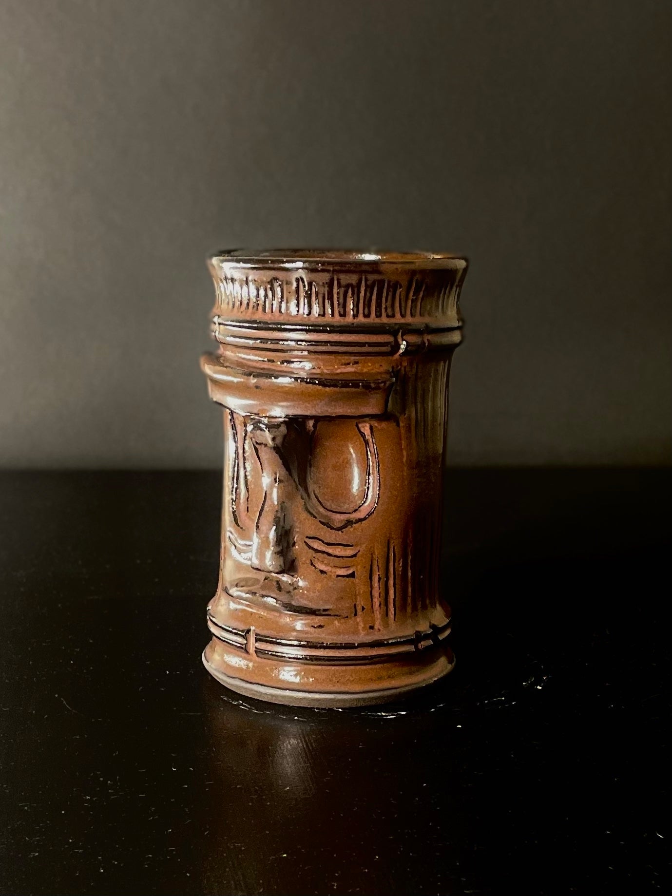 A 12oz Dark & Stormy tiki tumbler, with hand sculpted Maui head. Great for a Dark and Stormy or a Mai Tai . Made with cone 6 stoneware that is microwave and dishwasher safe. This piece is glazed with a food safe and lead free glaze.